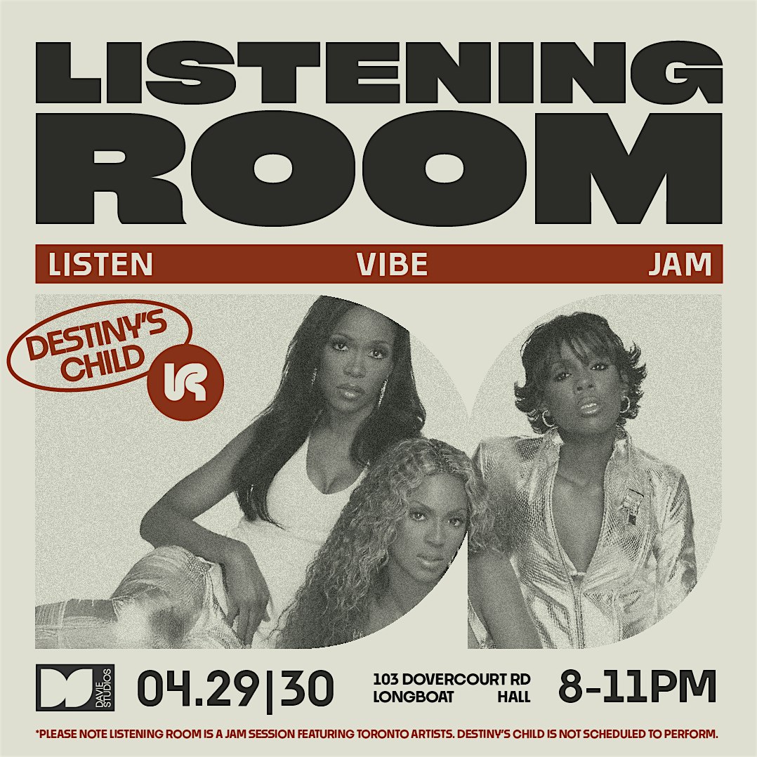 A night to listen, vibe and jam to the iconic music of Destiny's Child. @listeningroomtorontoOFFICIAL TICKET SALES STARTS SUNDAY, APRIL 19TH AT 12PM. - (19+ yrs) Wednesday, April 29th AND Thursday, April 30th. Tickets are only valid for the specific day you purchase them. Listening Room is a Neo-Soul jam series. The night is broken up into 3 parts inspired by the Soulquarians process to music creation. Musicians and music lovers alike are invited to step into our space to listen, vibe and jam around the iconic and nostalgic music of Destiny's Child! Come prepared to reimagine our favourite sounds! Each evening will be exceptionally unique and of the moment and energy of the room. Come prepared to listen, vibe, and jam!! DOORS AT 7:30PM. NO GUARUNTEED ENTRY AFTER 9:30PM.